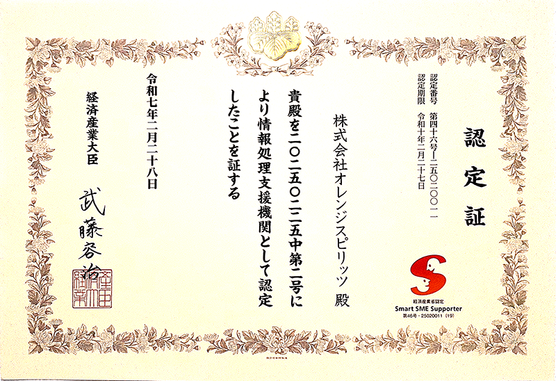 | 認定等 | ・経済産業省認定の情報処理支援機関 (スマートSMEサポーター) (認定番号:第46号-25020011) ・IT導入補助金IT導入支援事業者 (経済産業省) |